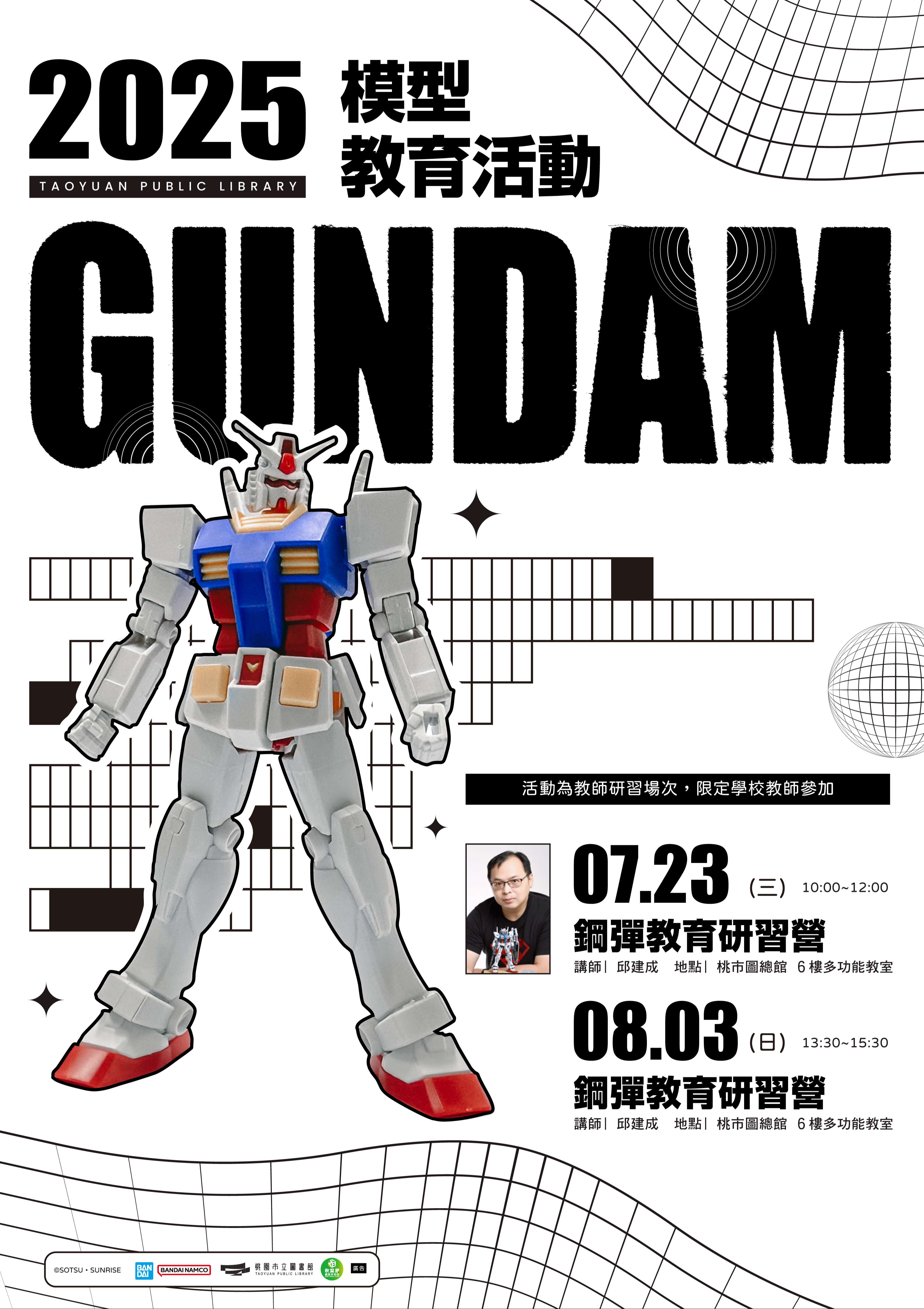 | 三、 | 活動將於114年7月23日(星期三)10時至12時,以及8月3日(星期日)下午1時30分至3時30分假桃園市立圖書館總館6樓多功能教室共辦理2場次,歡迎對鋼彈或模型課程有興趣的國小老師踴躍參與,全程參與者將可獲得2小時教師研習時數,並帶回鋼彈組裝模型套件(課程教材)1份,完全免費,機會難得,敬請把握! |