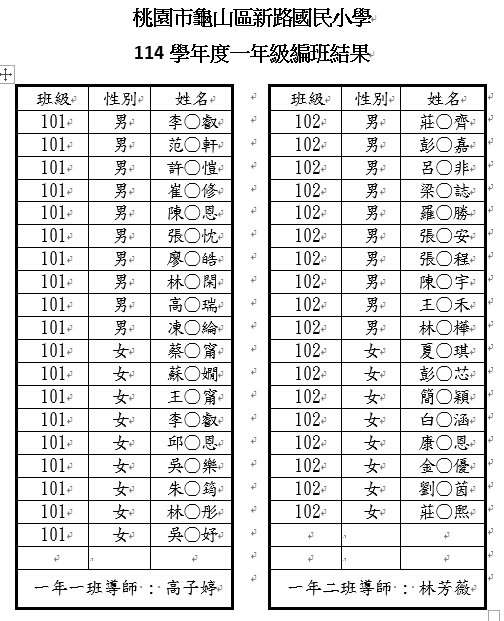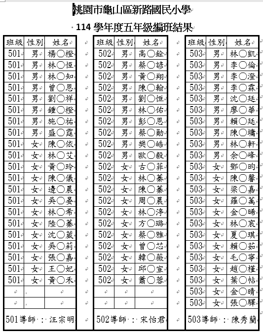 114學年度一、三、五年級編班結果暨導師編配公告