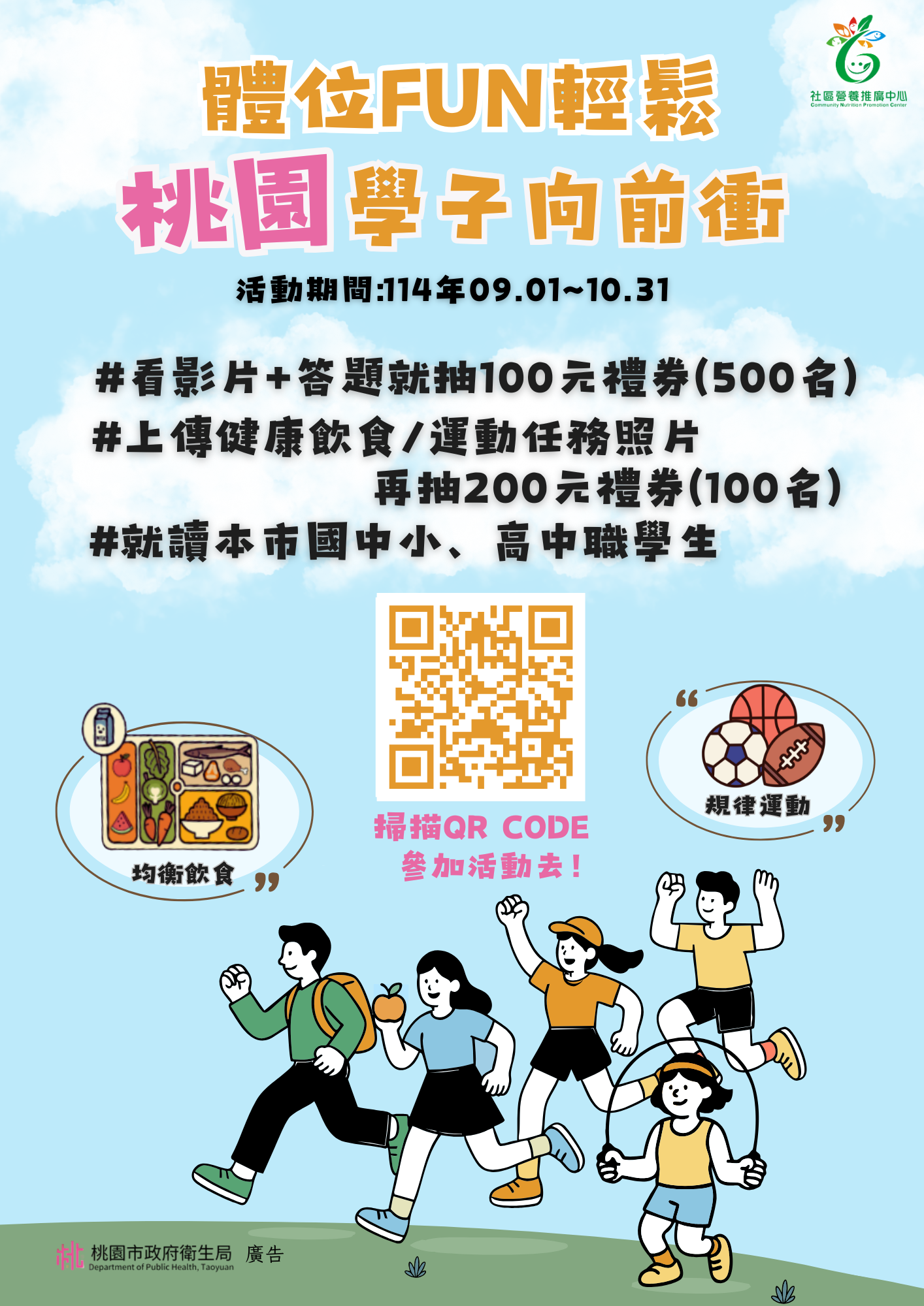 | 二、 | 為提升本市國中小、高中職生健康體位知能,該局規劃「看 片答題抽獎趣」、「任務挑戰抽好禮」及「學校獎勵機制」 等線上活動,希冀透過學習正確飲食方式及運動習慣,同時 將健康知識融入家庭生活落實健康體位,特辦理旨揭活動。 |