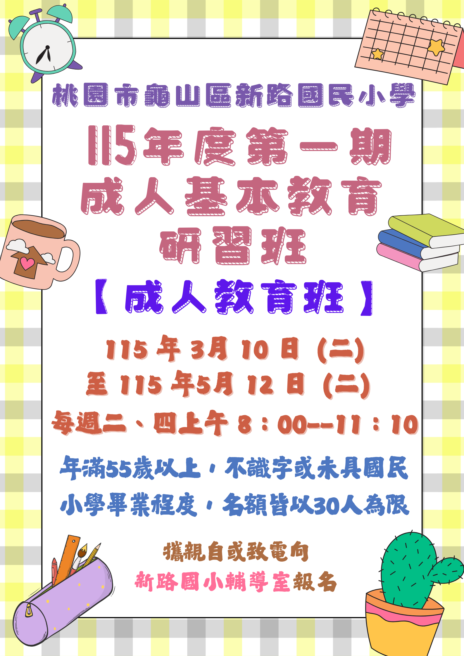 桃園市新路國小辦理 115 年度第一期成人基本教育研習班【成人教育班】招生簡章