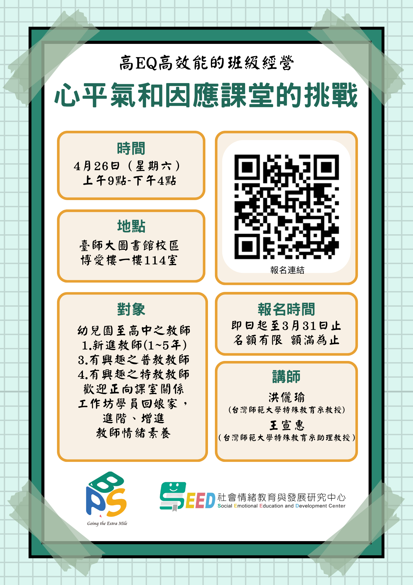 | 二、 | 臺師大為辦理師資培育大學社會責任實踐計畫,加強在地連結並服務該校地方教育輔導區縣市所轄各級學校,特邀該校特殊教育學系教授開設旨揭工作坊,以協助新進教師除了運用正向互動行為技能鏈結師培階段所習知識與課堂實務需求,同時加入教師情素養以減少課室管理壓力。 |