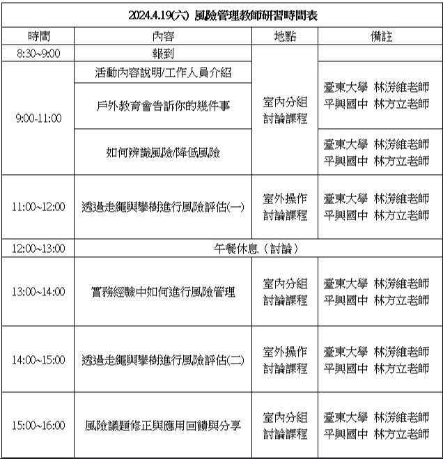 | (一) | 課程講師:林淓維老師(師大公領系戶外領導組博士,現任臺東大學助理教授);林方立老師(平興國中教師,國家級合球教練、全國推行體育有功及特殊優良教師) |