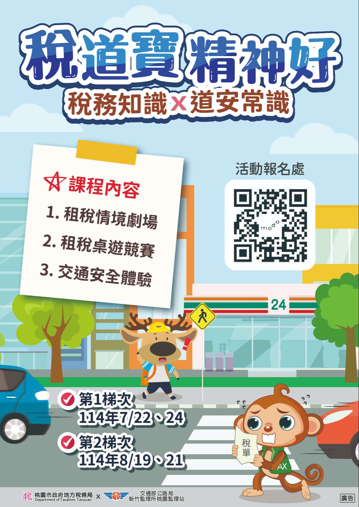 | 一、 | 為加深學生族群對雲端發票及租稅常識之了解,強化交通安全意識,本局與交通部公路局新竹區監理所桃園監理站(下稱桃園監理站)共同合作,以設計租稅服務情境劇場並結合租稅桌遊教具,讓學員於演練及遊戲中學習租稅觀念,另安排至桃園監理站全國首座「交通安全教育園區」,實地感受大型車視線死角及內輪差,希冀藉由活動體驗提升租稅與交通素養,營造守法安全好生活。 |