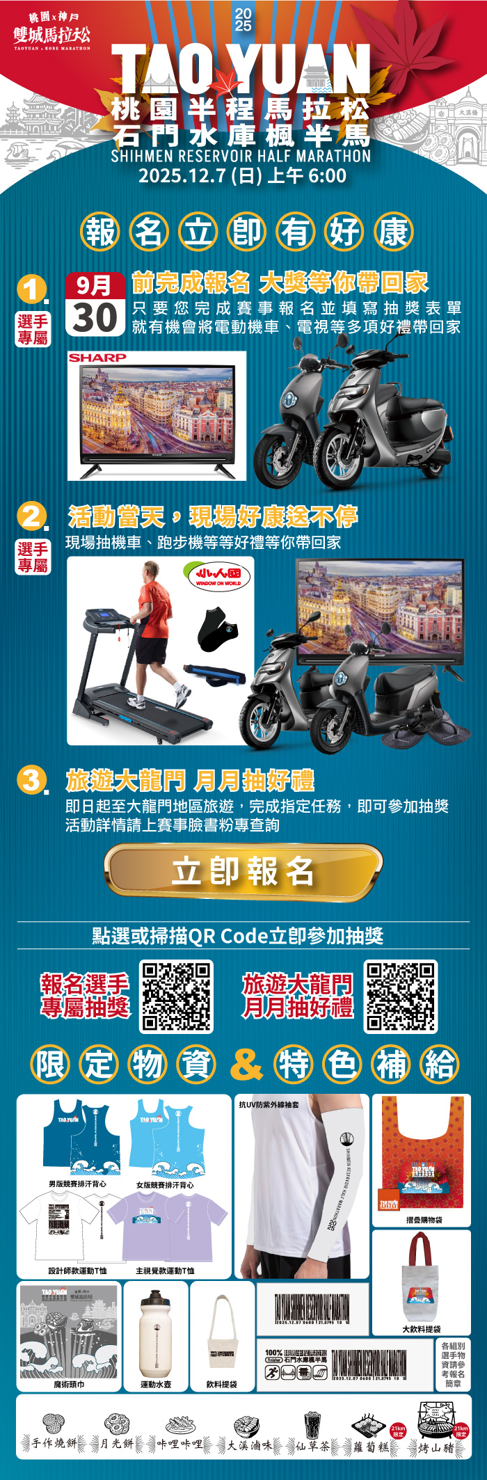 | 一、 | 本活動為本市主辦之年度全國大型路跑賽事,路線伴隨大溪石門美景並結合水壩風光,兼具挑戰及趣味,今年首度聯合日本神戶馬拉松,展開台日雙城「運動X觀光」交流合作,本次活動並新增身心障礙組,現場更規劃親子趣味運動體驗嘉年華,歡迎全國民眾踴躍報名參加。 |